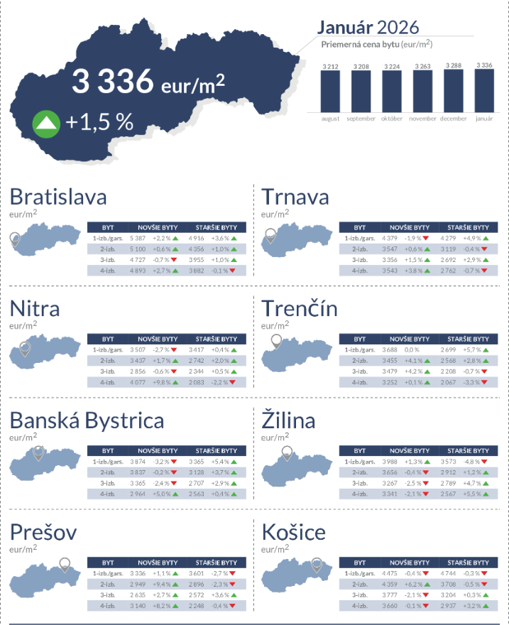 Podľa údajov Národnej banky Slovenska (NBS) prekročil medziročný vzostup cien v Košickom kraji hranicu 17 percent – z priemerných 2102 eur za meter štvorcový na 2469 eur. Priemerné ceny bývania v košickom regióne sú tak už o viac než deväť percent vyššie, než boli na doterajšom vrchole v roku 2022.