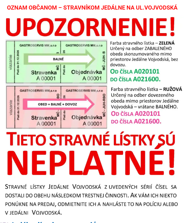 O tom, o aké série neplatných stravných lístkov ide, už zariadenie informovalo aj mestské časti.